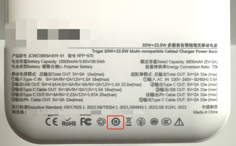 △画圈处为充电宝上的电池可循环使用5年年限标识