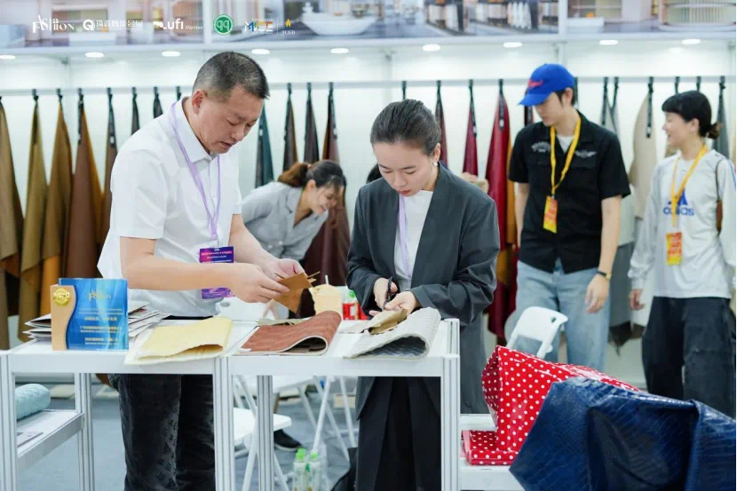 在中国展区的282家参展企业中,有116家企业来自花都,占比达41%,其中狮岭产业集群101家企业“组团出征”,皮具、服饰、箱包等优势品类集体亮相,成为展会最亮眼的“中国力量”。从原创设计的时尚皮具到功能美学兼具的箱包,从高端面料到穿戴配件,花都展区日均接待买家超千人次,成为国际采购商争相驻足的“焦点阵地”。